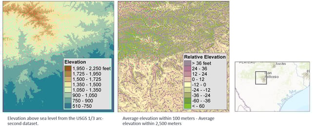 Relative elevation measures whether a point is higher or lower than the surrounding area