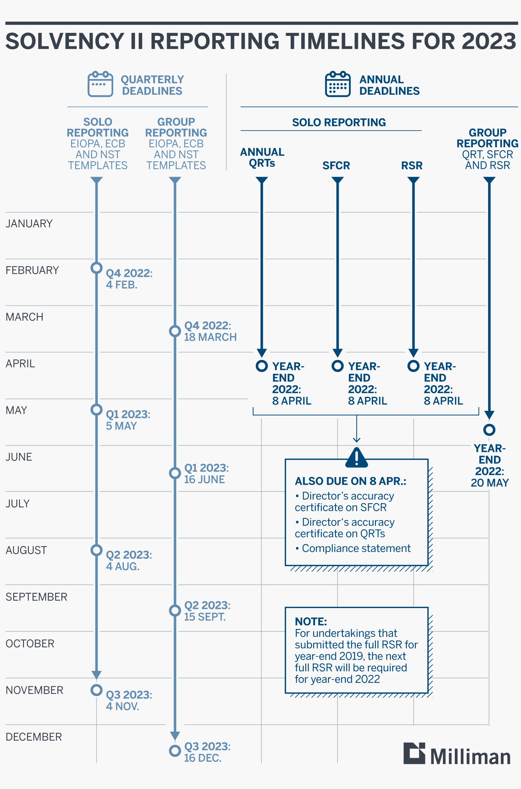 To help prepare for Solvency II reporting throughout 2023, we have prepared a briefing note detailing Solvency II reporting deadlines in 2023 and the changes in the reporting framework relative to the previous year. The document also includes a detailed timeline, highlighting the key deadlines in respect to calendar year 2023 for both solo entities and groups (assuming a year-end reporting date of 31 December).
