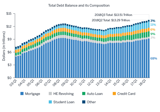 1 Calculations based on the quarterly report on Household Debt and Credit for Q3 2018, published by the Federal Reserve Bank of New York. Retrieved February 13, 2019, from https://www.newyorkfed.org/microeconomics/hhdc.html.