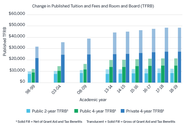 Over the past 10 years, the one-year change in published costs for tuition and fees has moderated, at first hovering in the low single digits for each school category and then flattening further in recent years. This moderation is a change from over a decade ago, when one-year increases between 4.5% and 10.3% were far more common.3 Figure 2 shows the changes in both gross and net published tuition, fees, and room and board since the 1998-99 school year.