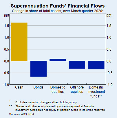 Super funds increased their aggregate cash holdings by $51 billion over the March 2020 quarter—about half of that was caused by members switching from higher-risk investments into cash, according to the RBA.2