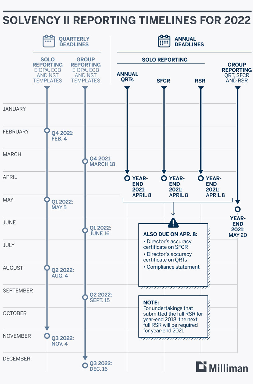 2022年を通したソルベンシーII報告の準備を支援するため、本稿では、ソルベンシーII報告の2022年の報告期限および報告フレームワークの前年からの変更点についてまとめました。また、詳細なタイムラインを掲載し、単体の保険会社および保険グループ両方の2022年(12月31日を年度末決算日とした場合)の主要報告期限をハイライトします。